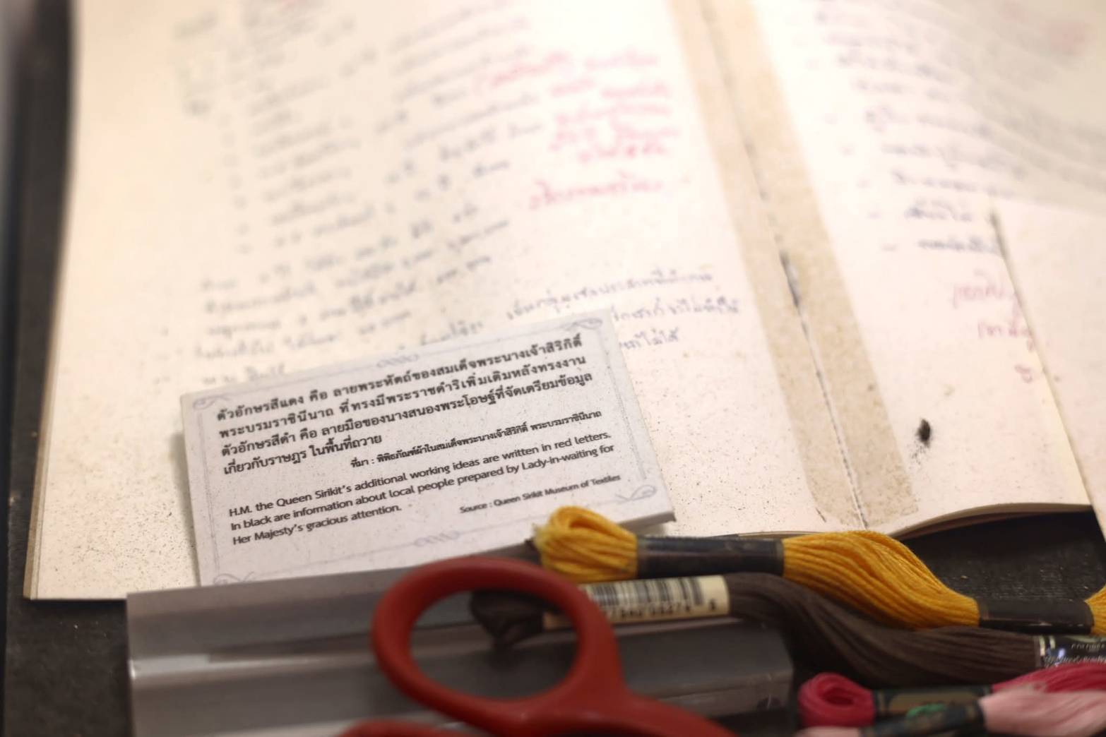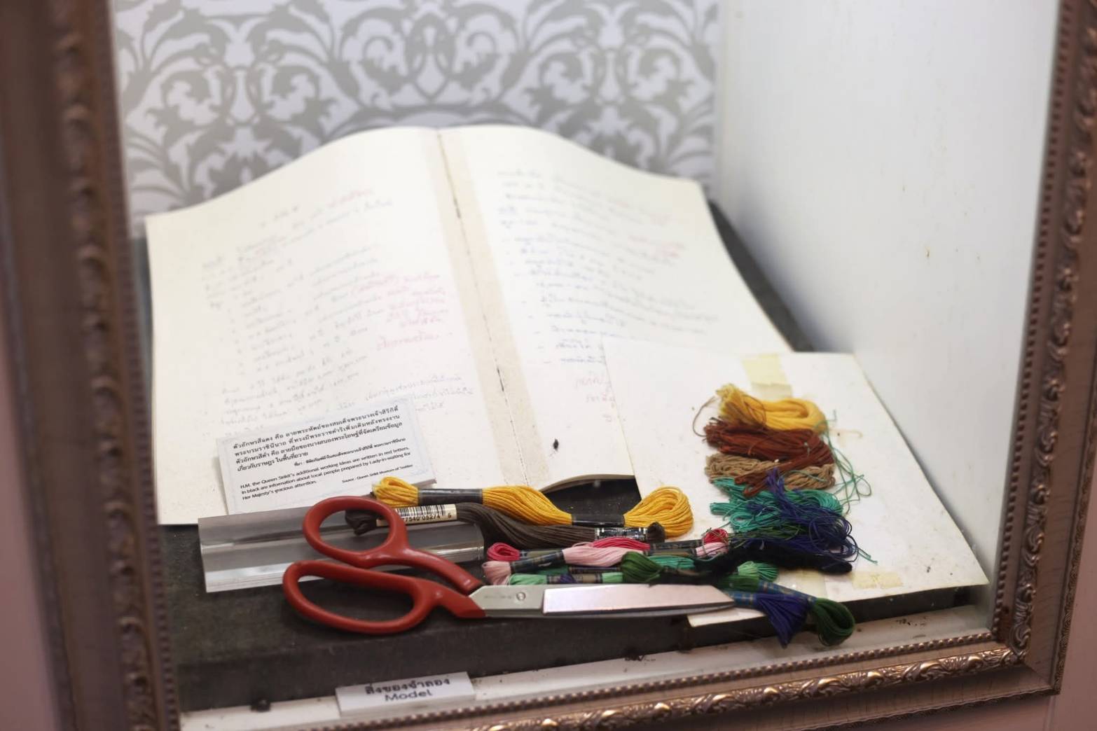 - กรรไกรตัดผ้า เข็มด้าย และห่วงปักผ้า เครื่องมือทรงงานหัตถกรรมที่ใช้จริง