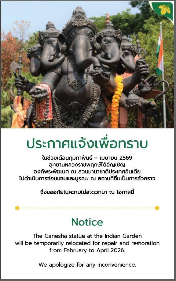 The Ganesha statue at the Indian Garden will be temporarily relocated for repair and restoration from February to April 2026.