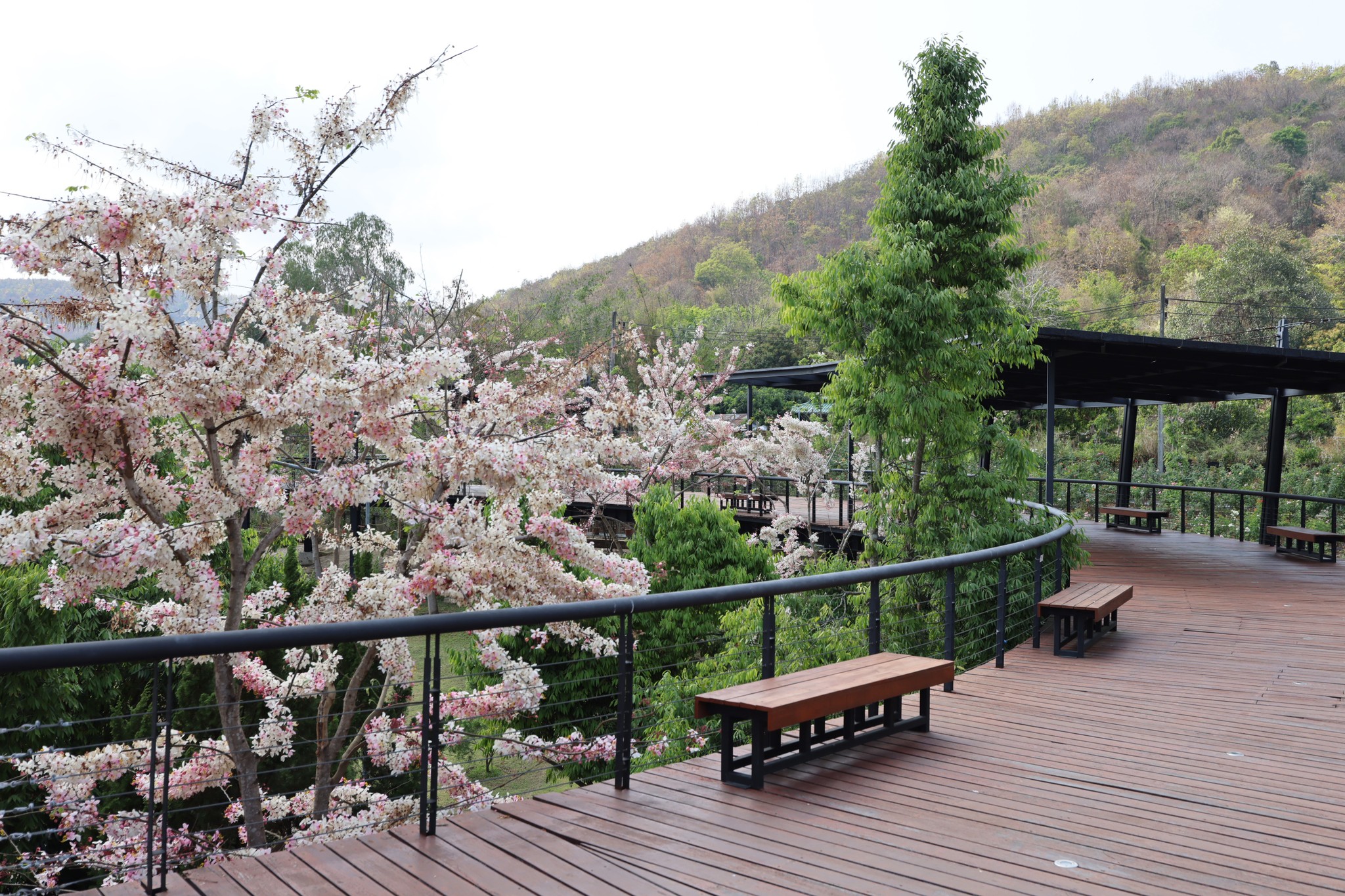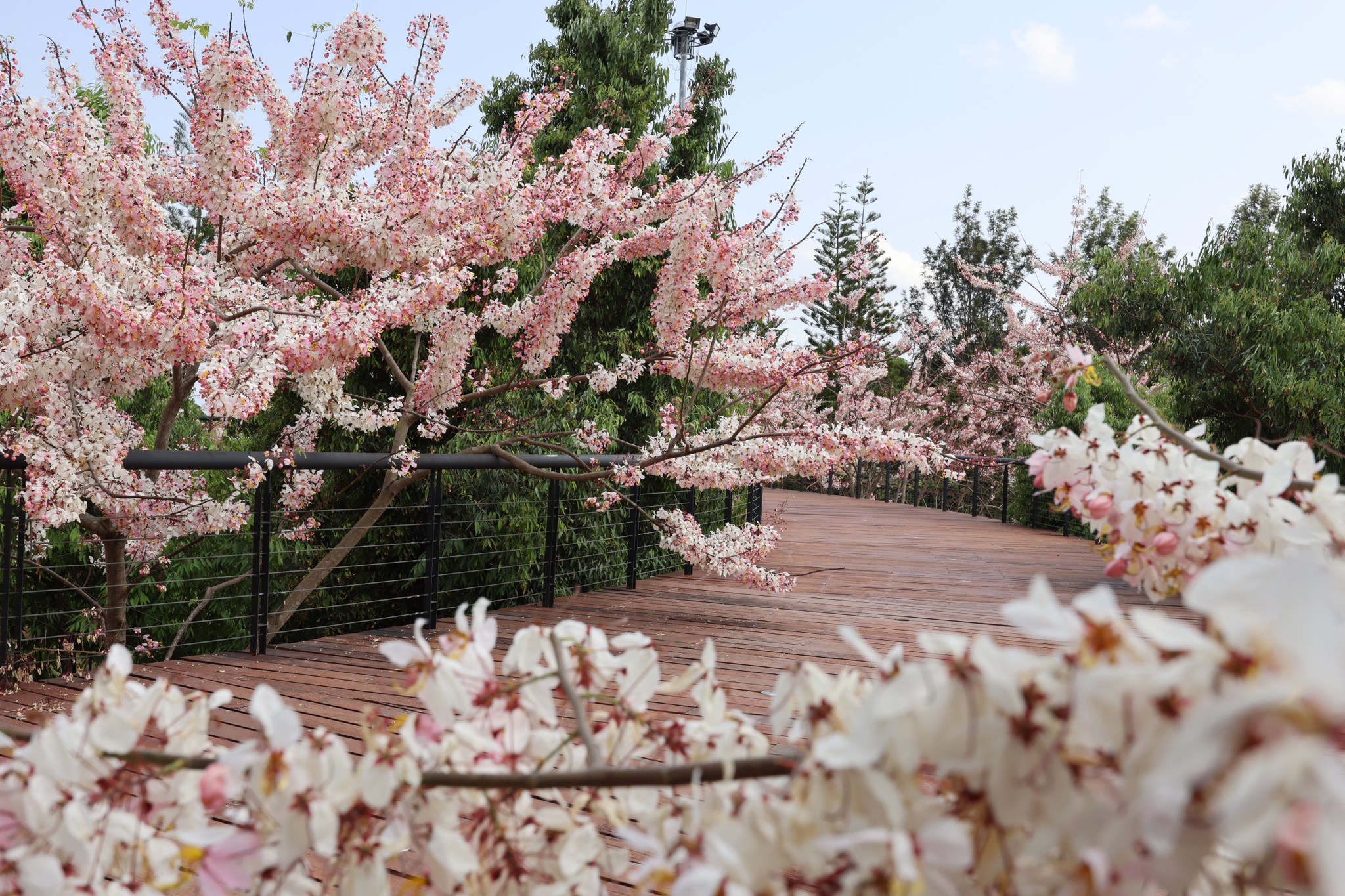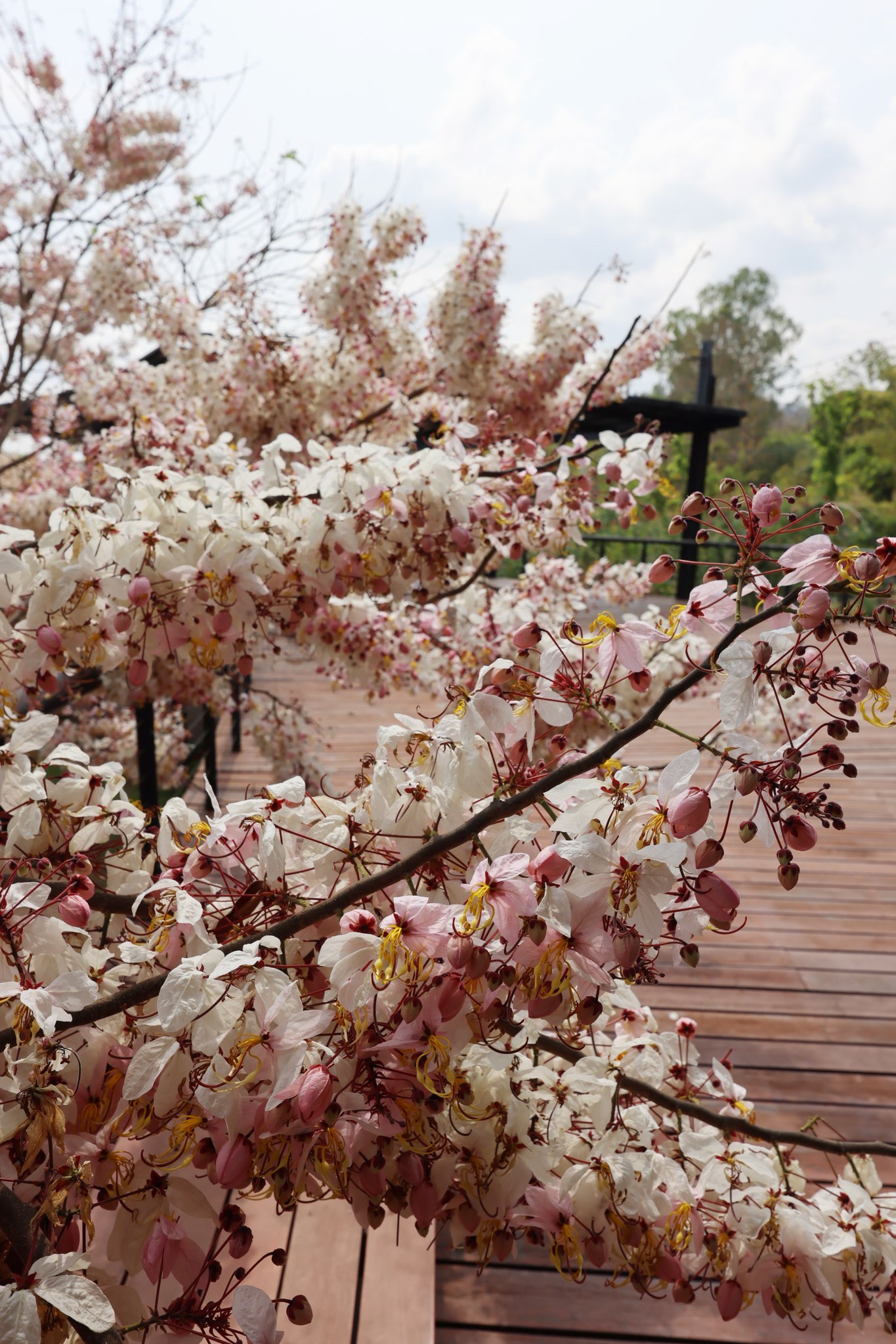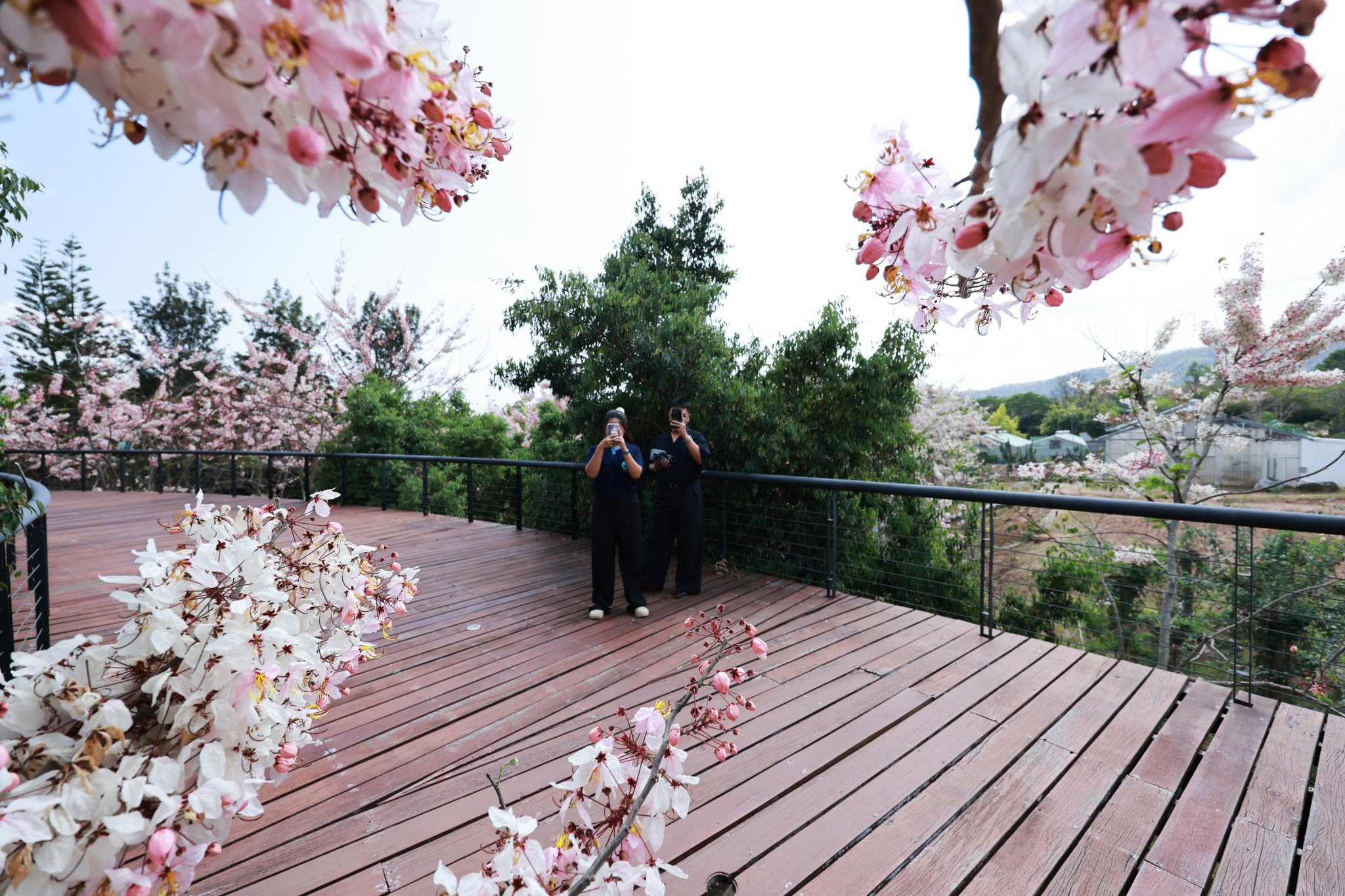 ตอนนี้หลายต้นกำลังออกดอกเต็มช่อ สีชมพู-ขาวหวานละมุนตัดกับท้องฟ้าและแนวต้นไม้เขียวขจี กลายเป็นมุมถ่ายภาพสุดโรแมนติกที่ไม่ควรพลาด