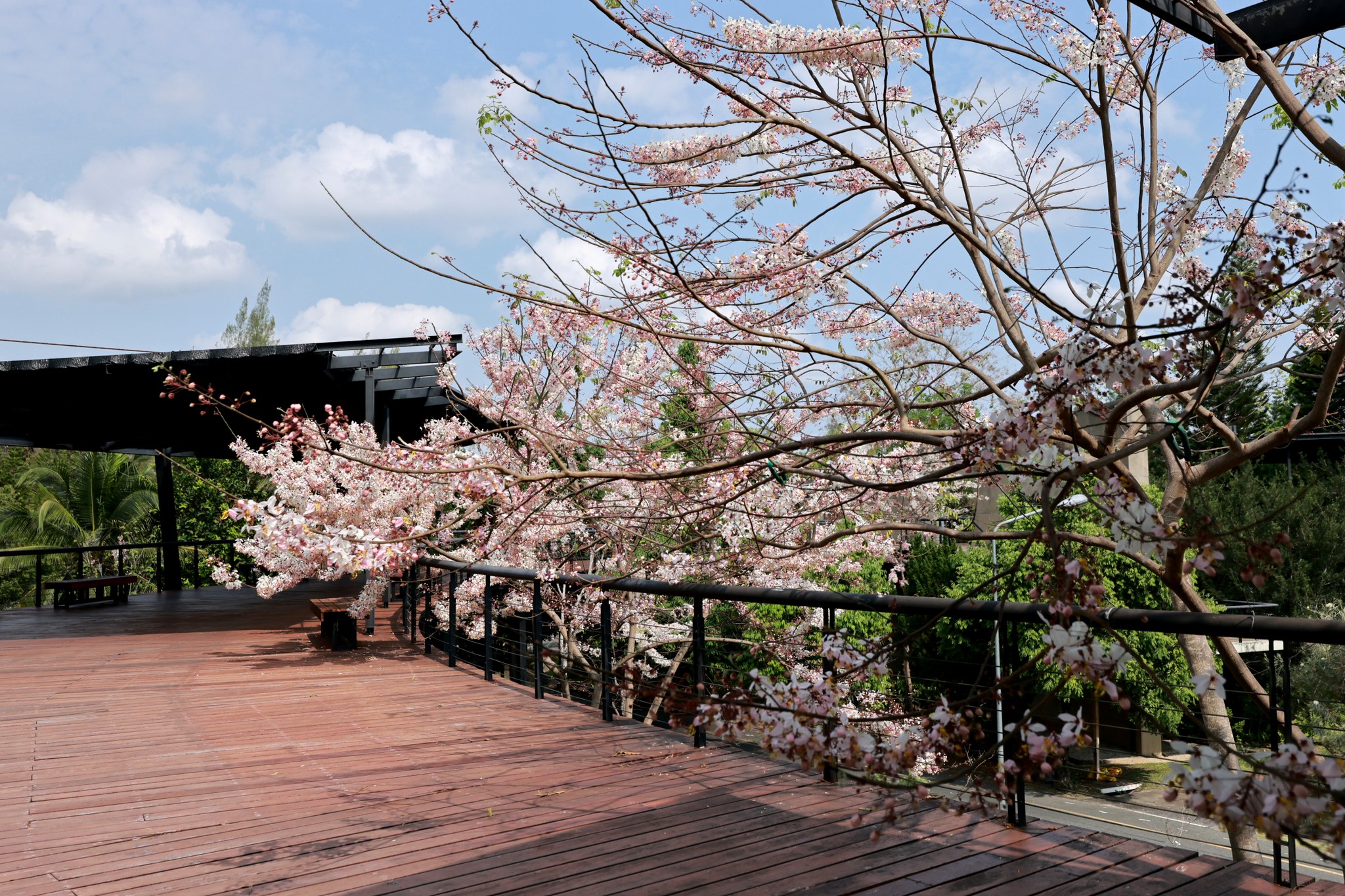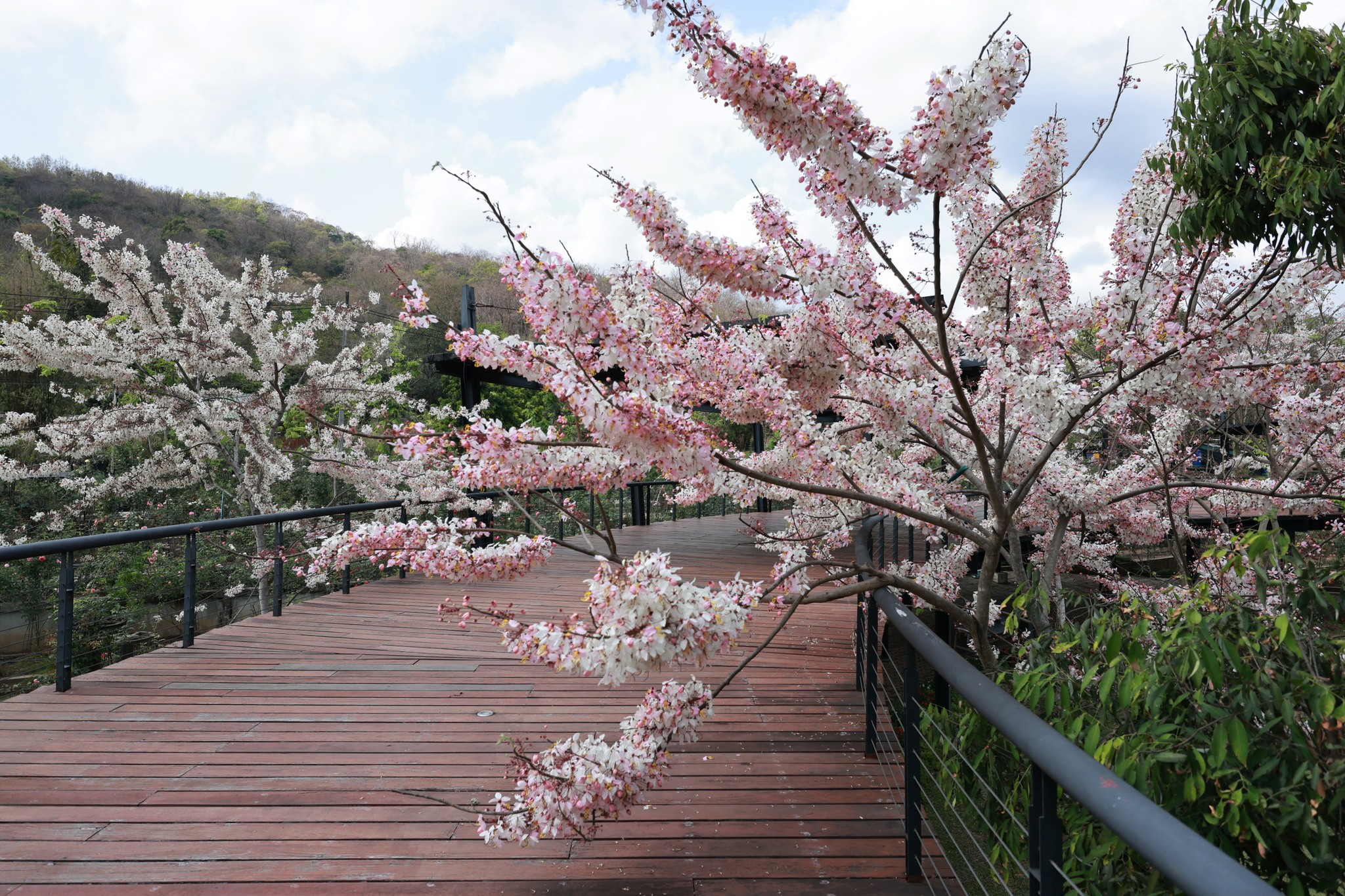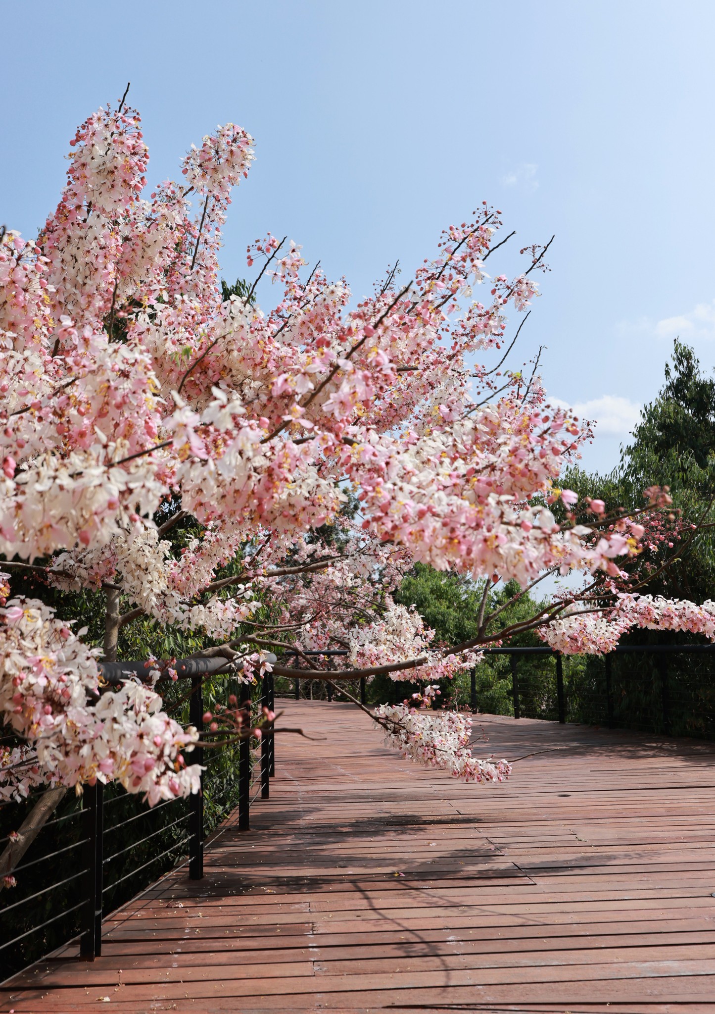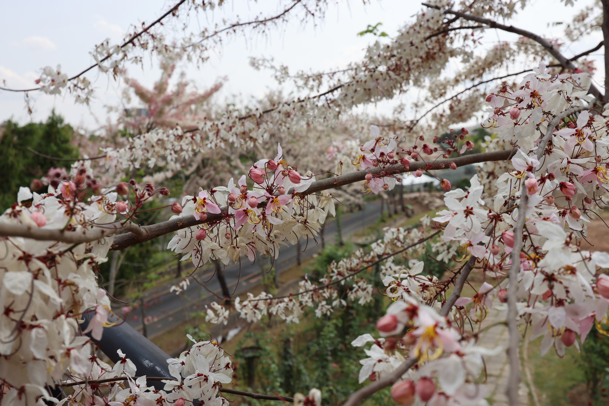 ตอนนี้หลายต้นกำลังออกดอกเต็มช่อ สีชมพู-ขาวหวานละมุนตัดกับท้องฟ้าและแนวต้นไม้เขียวขจี กลายเป็นมุมถ่ายภาพสุดโรแมนติกที่ไม่ควรพลาด