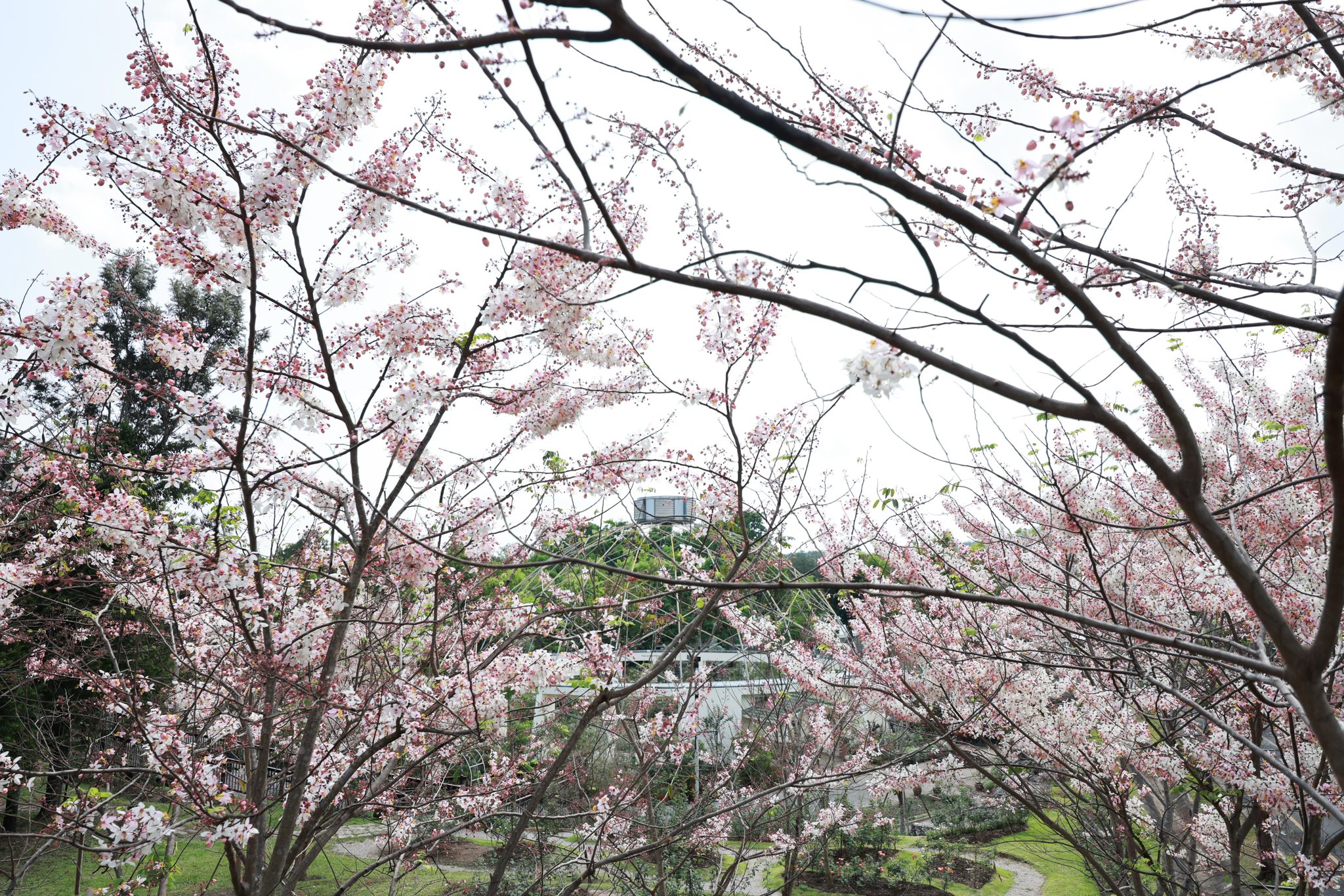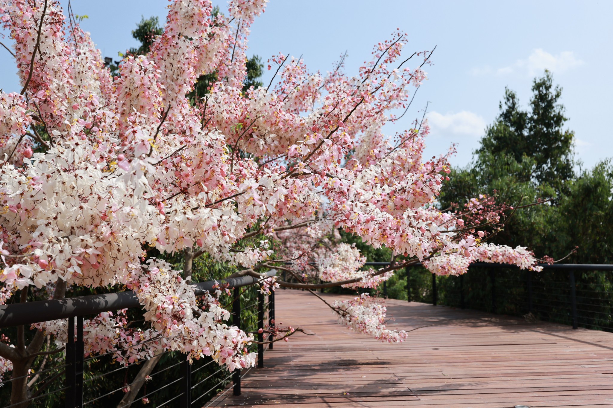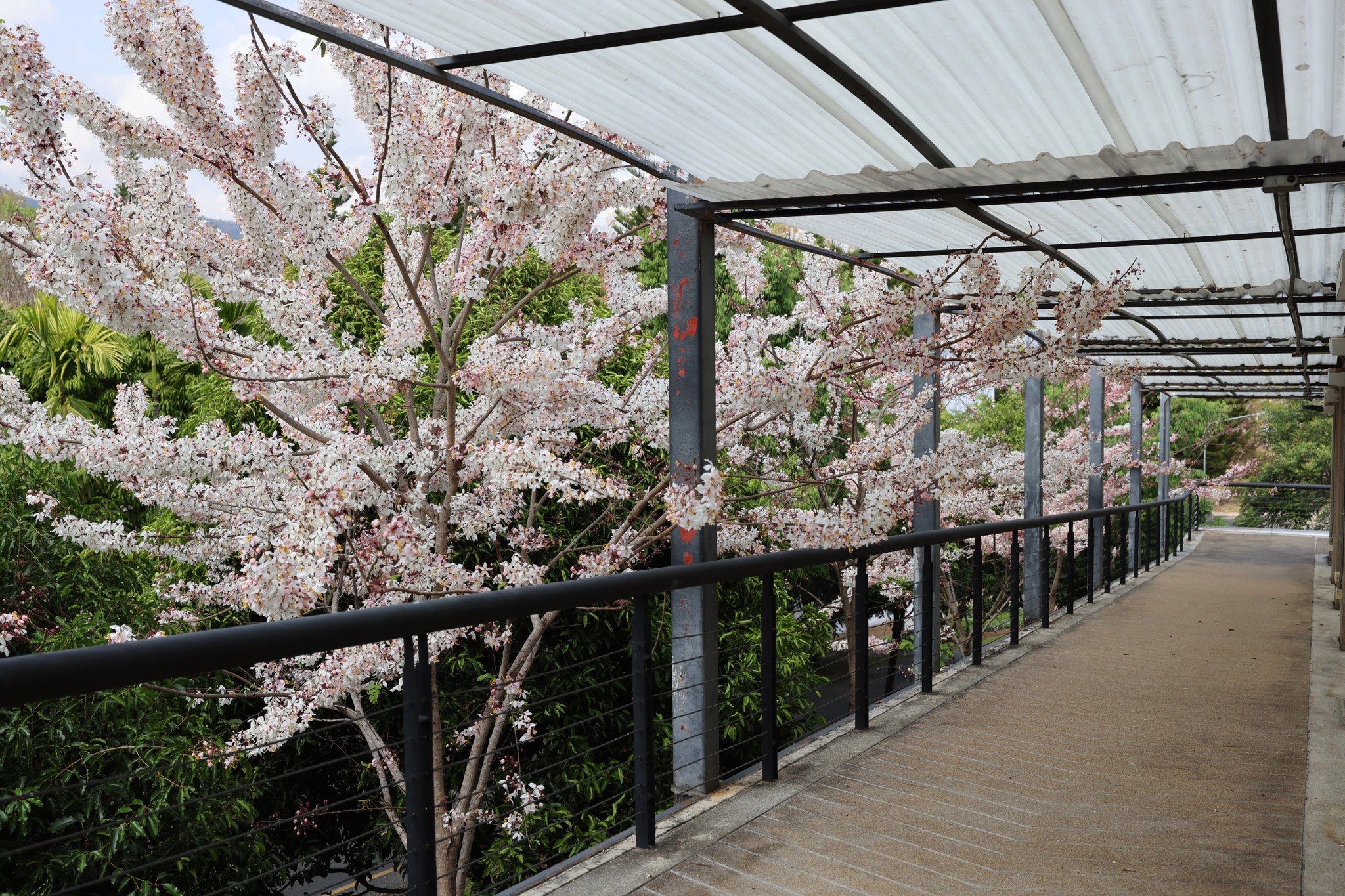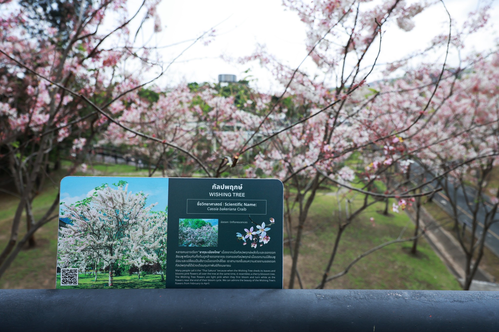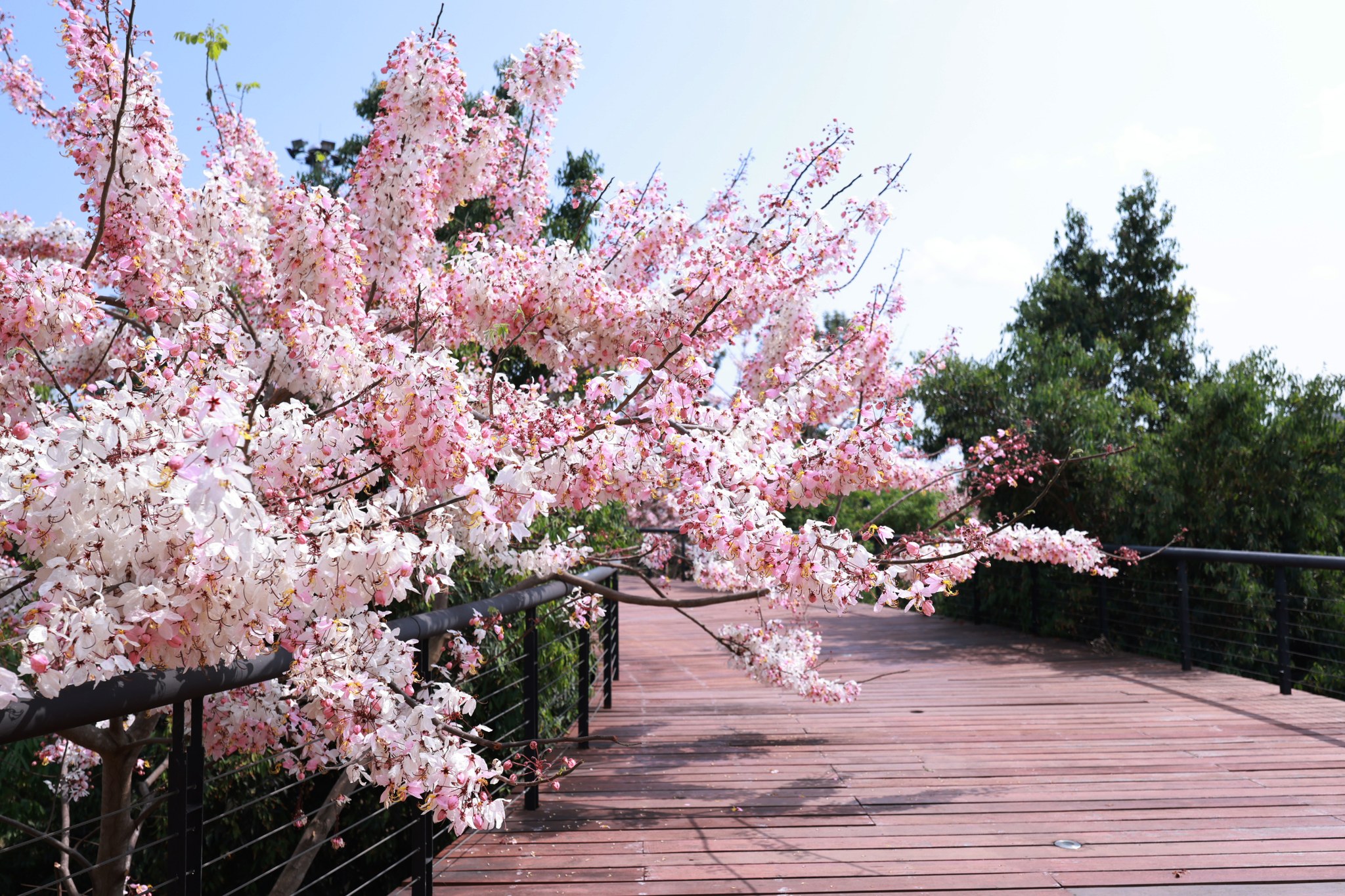 ตอนนี้หลายต้นกำลังออกดอกเต็มช่อ สีชมพู-ขาวหวานละมุนตัดกับท้องฟ้าและแนวต้นไม้เขียวขจี กลายเป็นมุมถ่ายภาพสุดโรแมนติกที่ไม่ควรพลาด