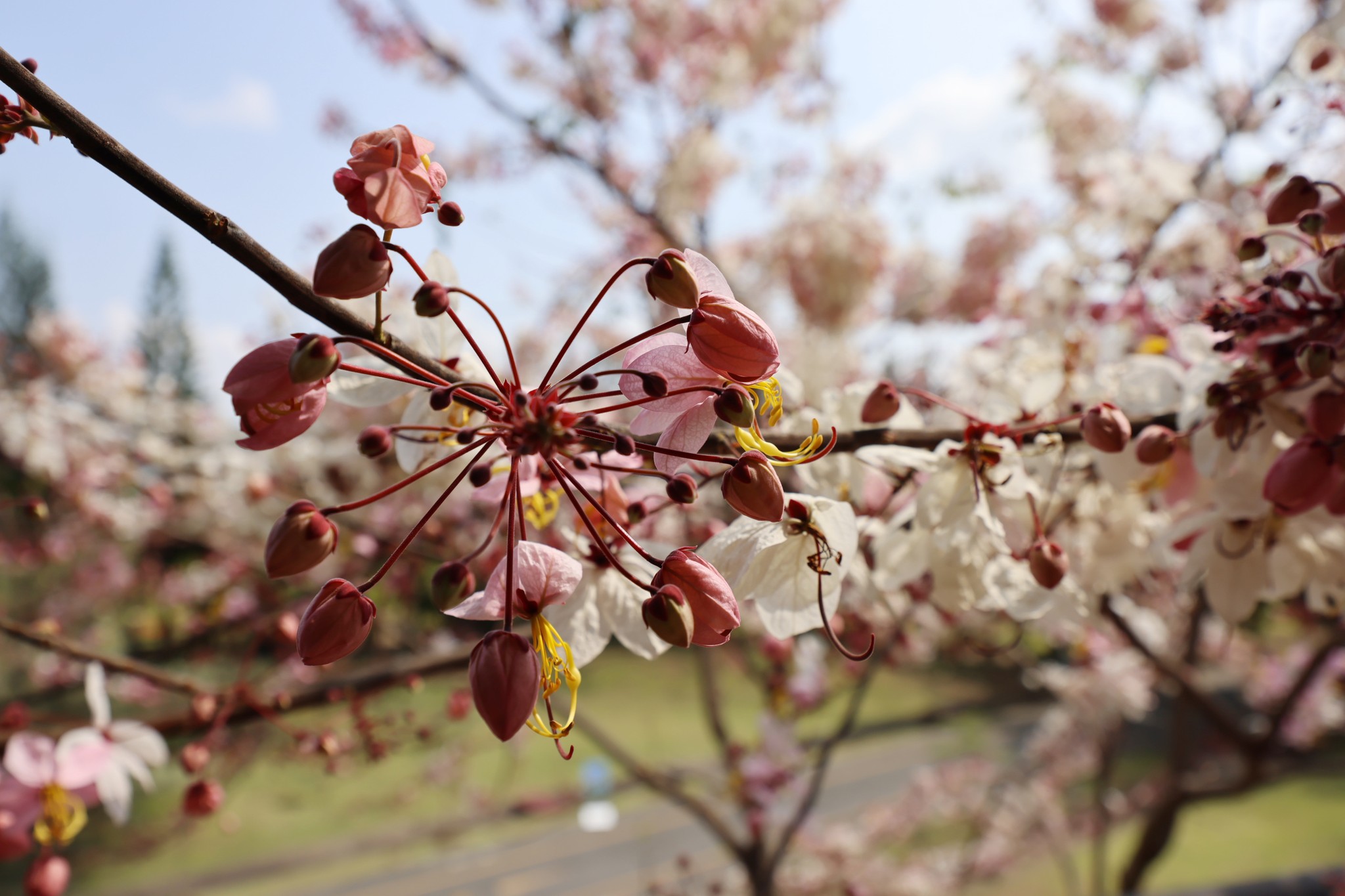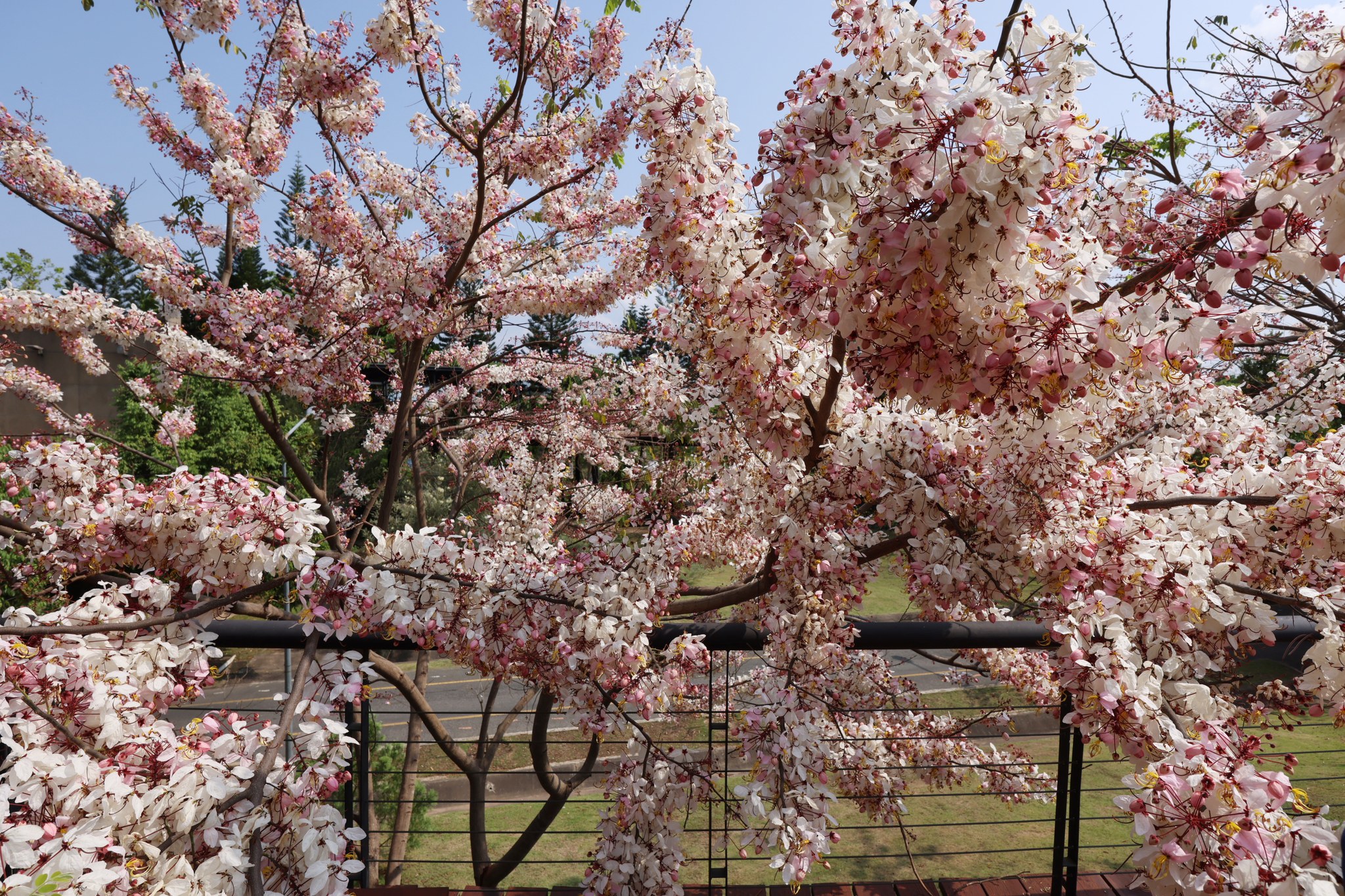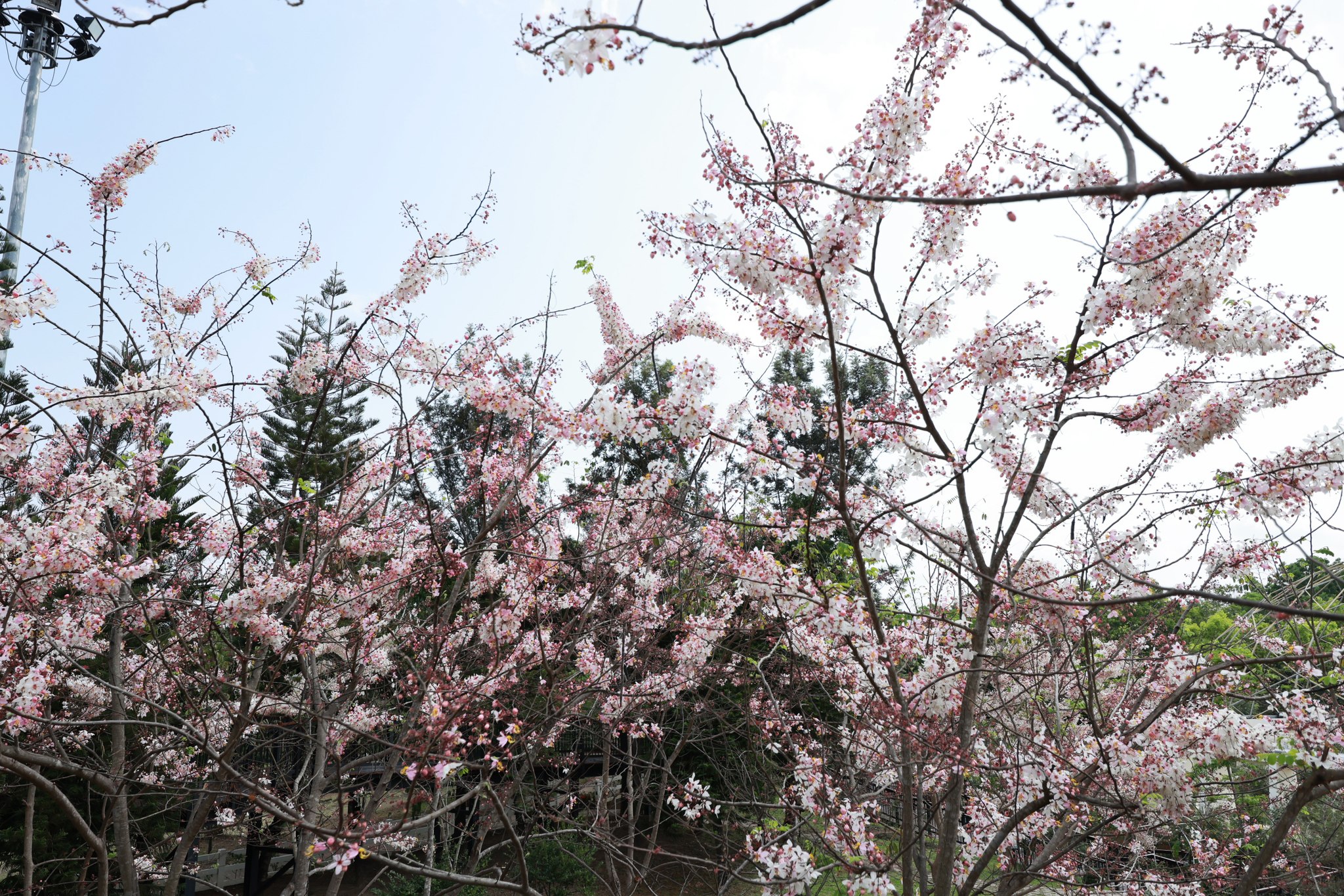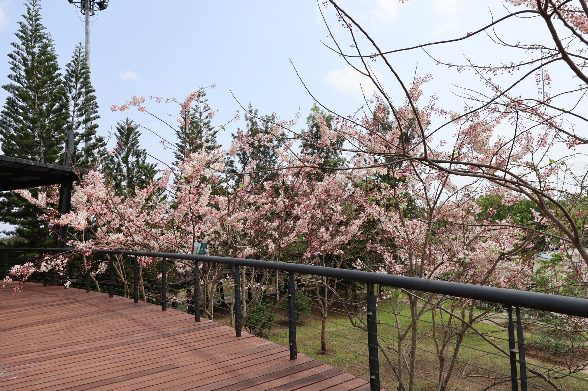 ตอนนี้หลายต้นกำลังออกดอกเต็มช่อ สีชมพู-ขาวหวานละมุนตัดกับท้องฟ้าและแนวต้นไม้เขียวขจี กลายเป็นมุมถ่ายภาพสุดโรแมนติกที่ไม่ควรพลาด